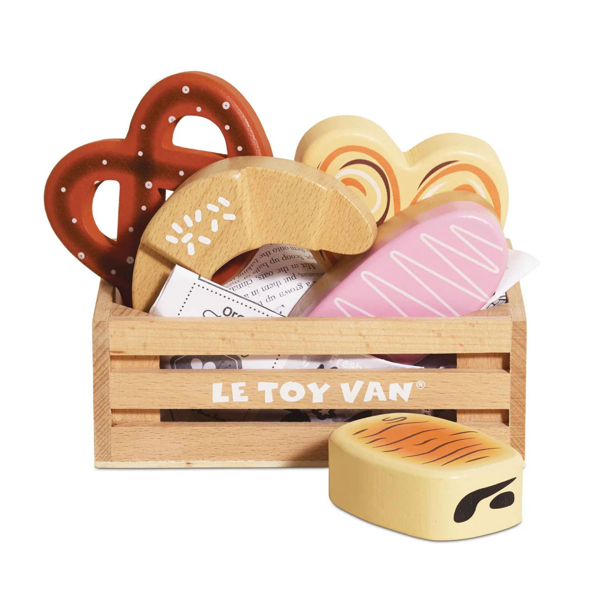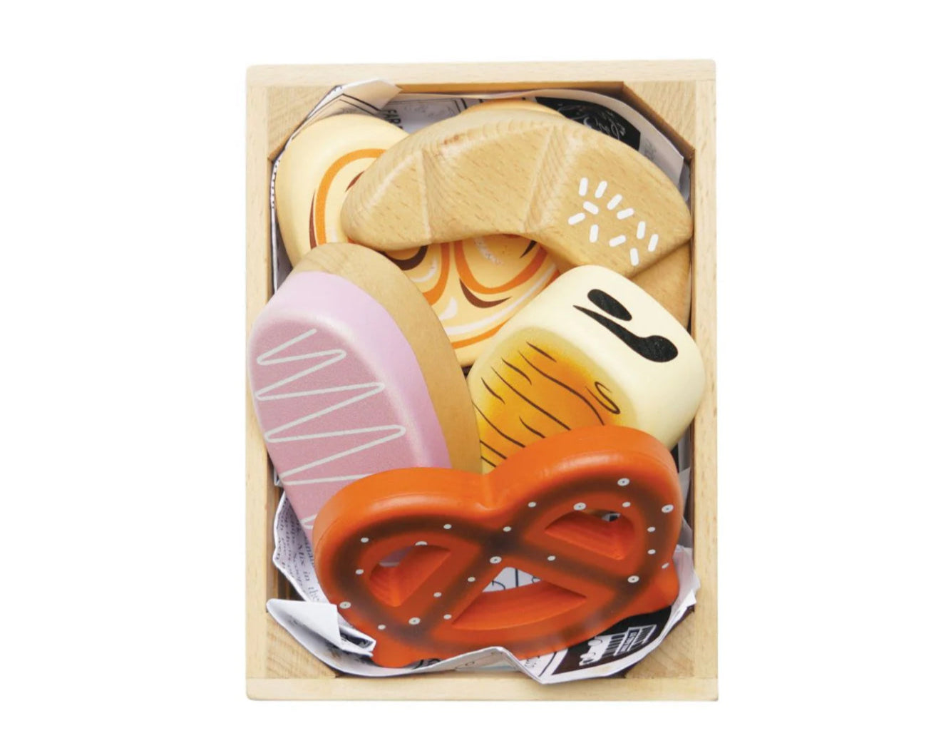 ארגז שוק מתוק כולל בתוכו שלל מאפים טעימים, בניהם בייגלה, לחמנייה, קרואסון ועוד  מגיע עם תוספת בסגנון עיתון, למשחק מציאותי.