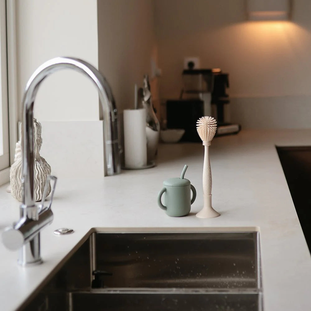 בצד השני, ראש מברשת קטן יותר לניקוי מדויק של פטמות הבקבוק ואזורים צרים.