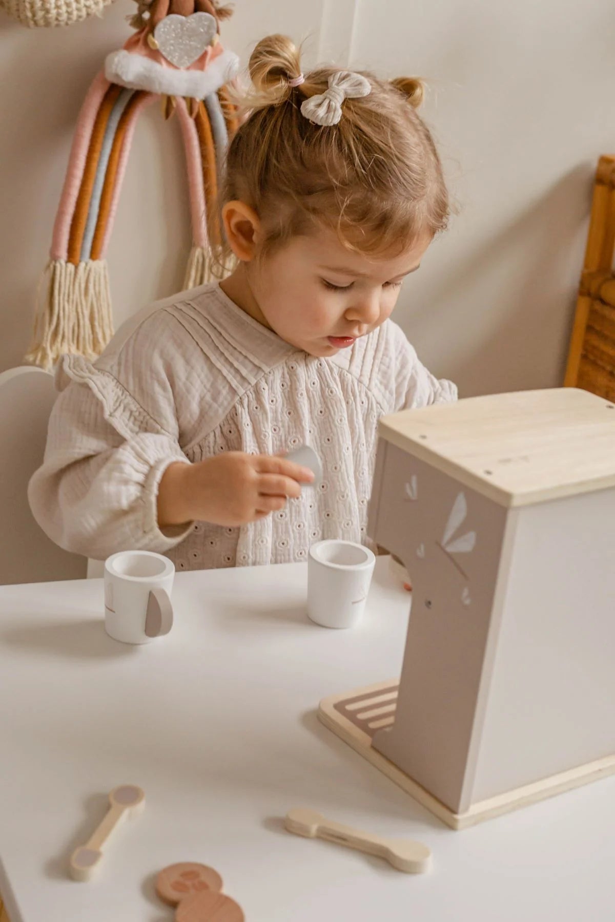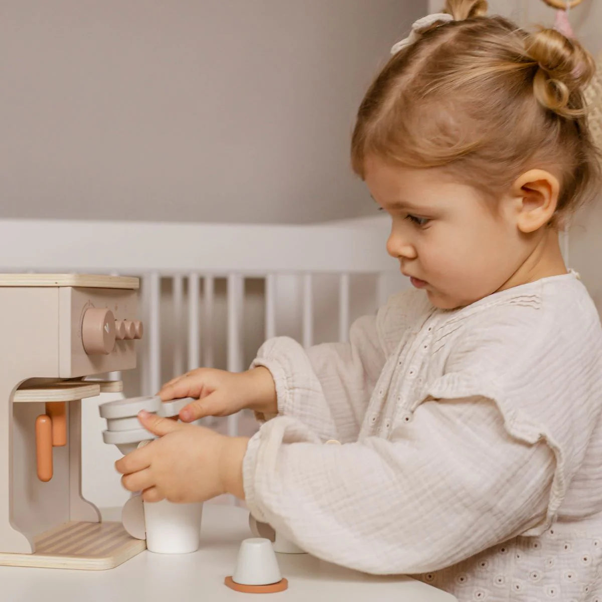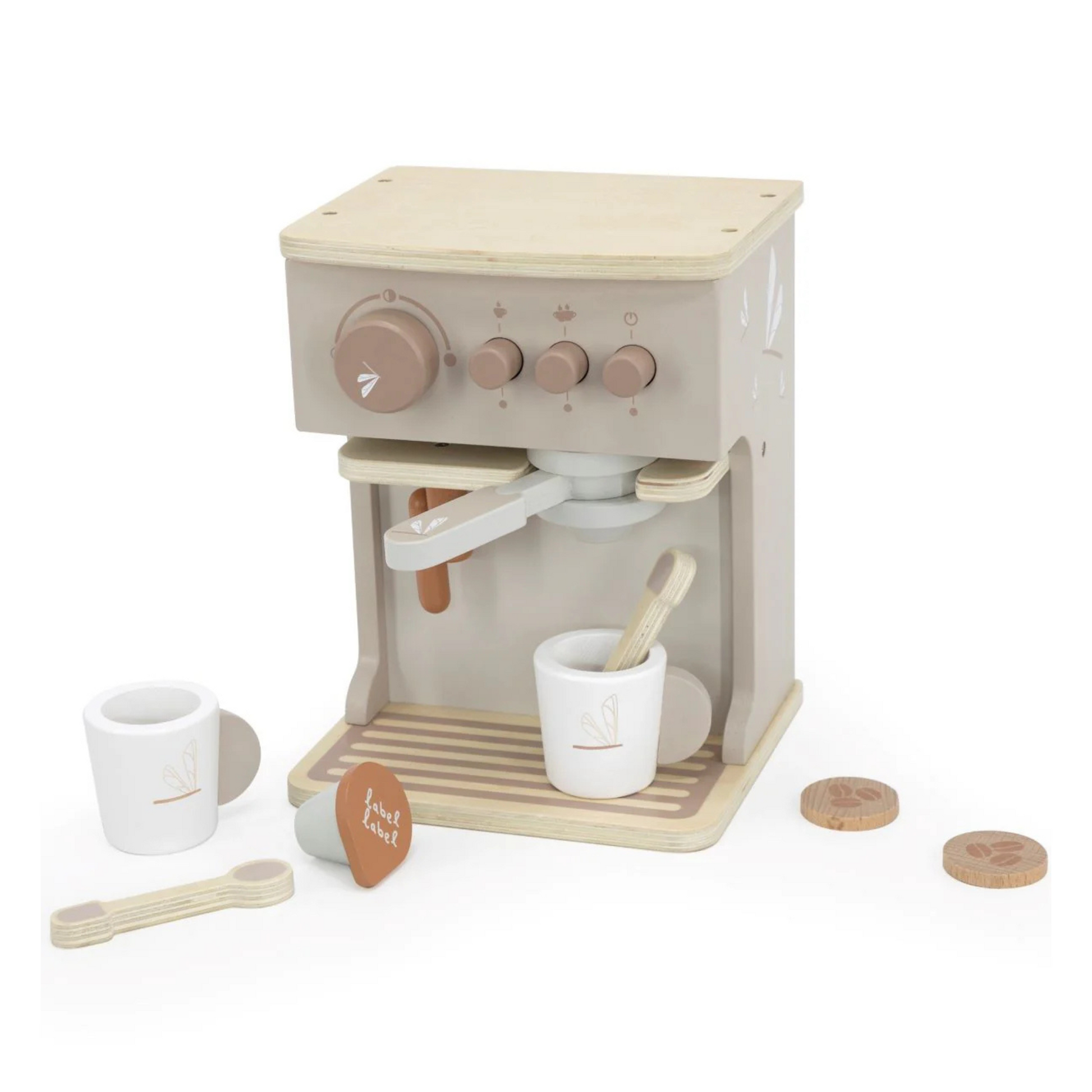 מכונת קפה בצבע ניוד, מקסימה שתשתלב באופן מושלם עם מטבח העץ שלנו ותהפוך את הקטנטנים שלכם לבריסטה אמיתית!