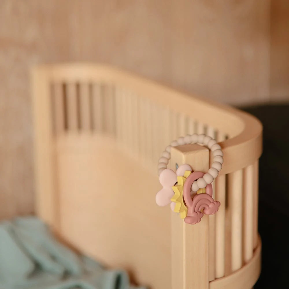 טבעת לעיסוי חניכיים עם שלושה אלמנטים טבעיים קטנים (שמש, קשת צבעים, ופרח חרצית), מיועדת להקל על חניכיים כואבות ולספק הקלה לקטנים ושקט נפשי להורים. טבעת לעיסוי החניכיים כוללת צורות ומרקמים שונים, שיעוררו את החושים של הילדים בזמן שהם שוקעים את חניכיהם בחומר סיליקון רך ברמה המזון 100%. הטבעות מגיעות בעיצובים משחקיים שמתאימים לכל טעם, והן יוסיפו טאץ' סטייל לביתכם.