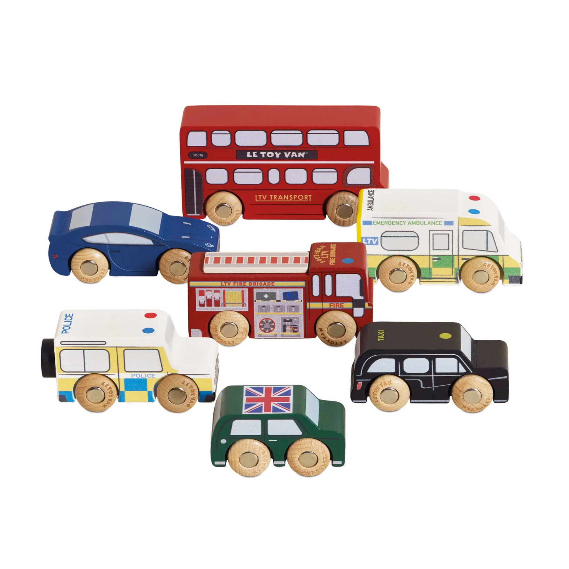 סט מכוניות צעצוע מעץ הכולל 7 רכבים לונדוניים איקוניים; אוטובוס דו קומתי, מונית שחורה, כבאית, ניידת משטרה, אמבולנס ו -2 מכוניות ספורטיביות