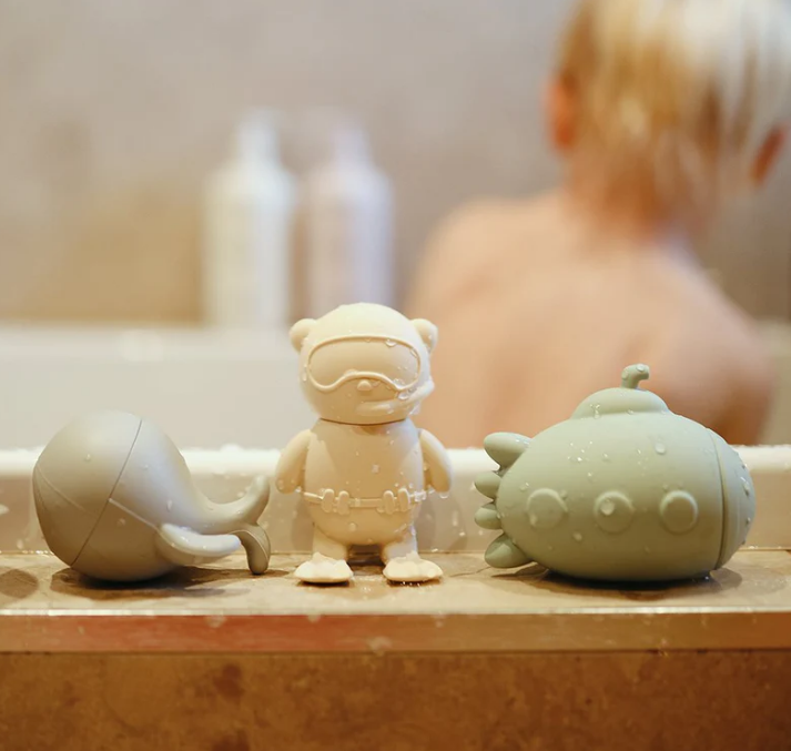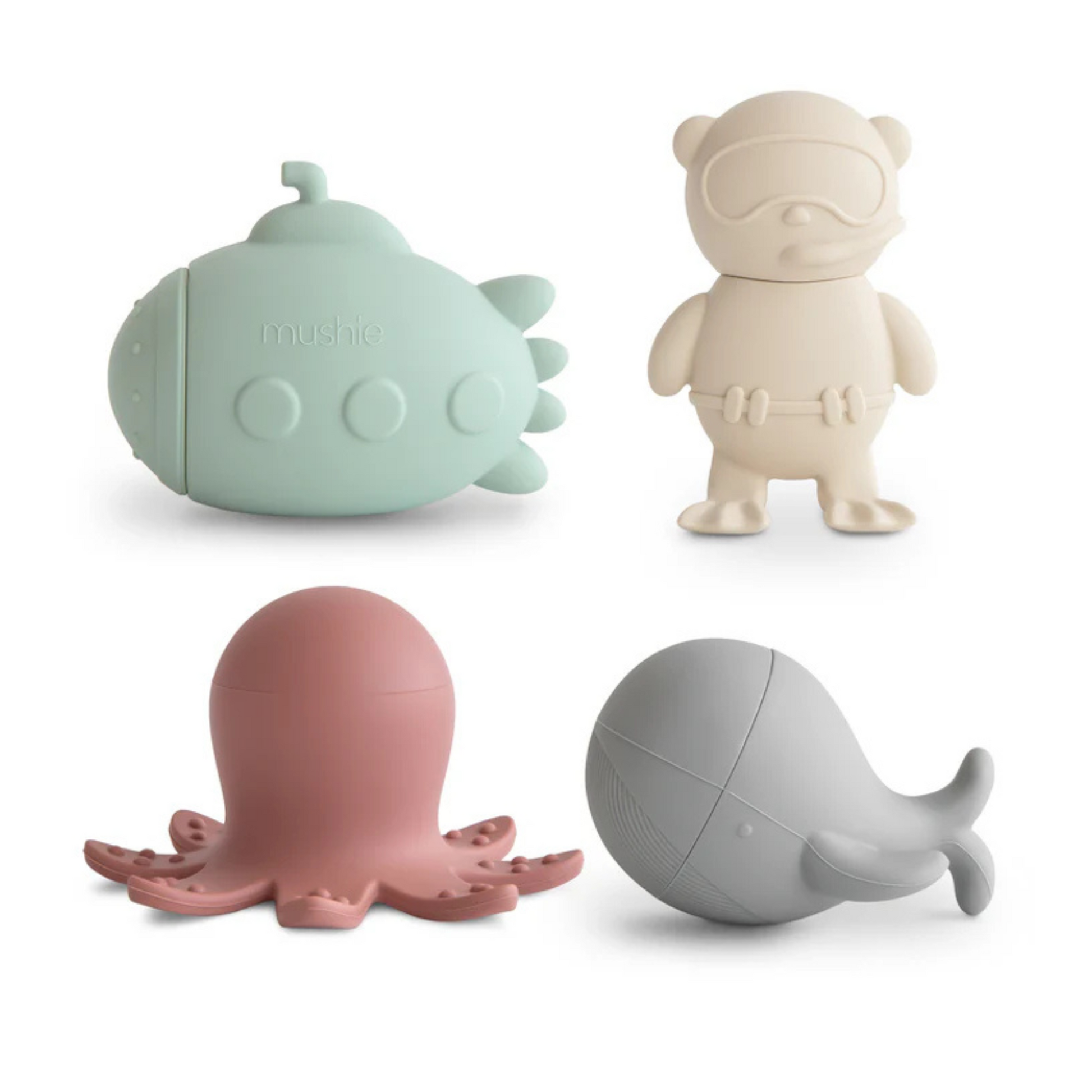 ערכת משחקי האמבט של מושי היא סט של צעצועי סיליקון עמידים במים.