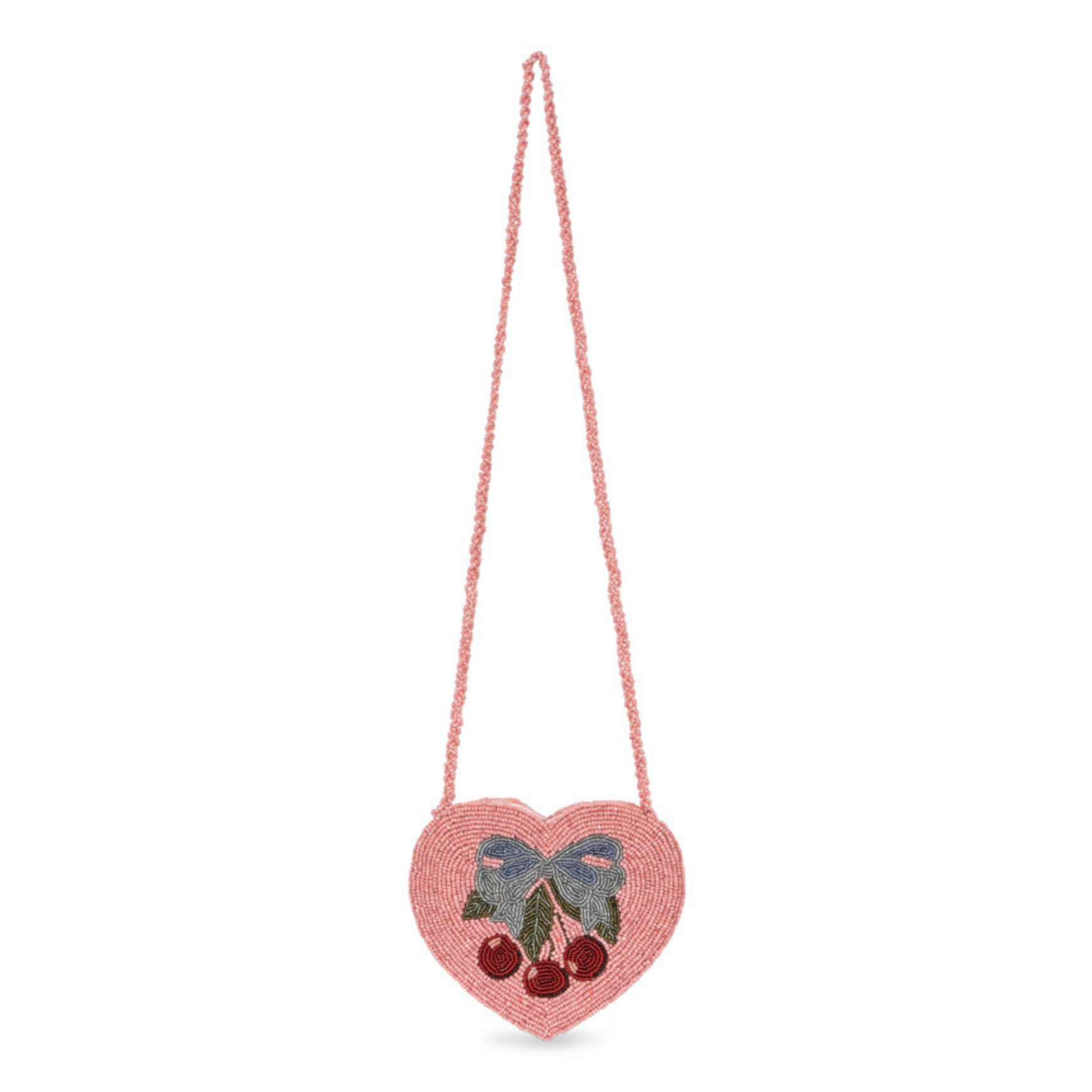 תיק כתף קטן ומתוק בצורת לב, מעוטר בחרוזים המחוברים בעבודת יד. כל פריט מיוצר בעבודת יד והוא ייחודי.