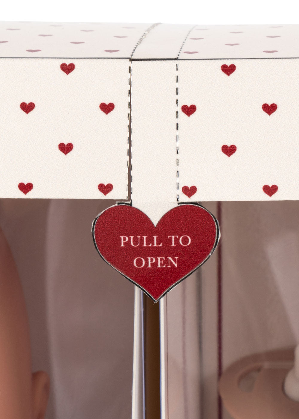 שתי הבובות לבושות בסטים דו-חלקיים מבד כותנה וכוללות מוצצים להרגעה.