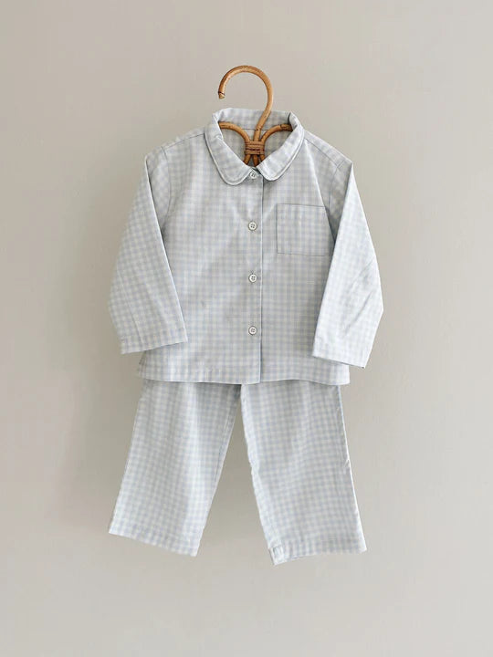 סט פיג'מה על-זמני מבית Lalaby, עשוי מכותנה אורגנית רכה במיוחד, באריגת גינגהאם קלאסית בצבע תכלת.