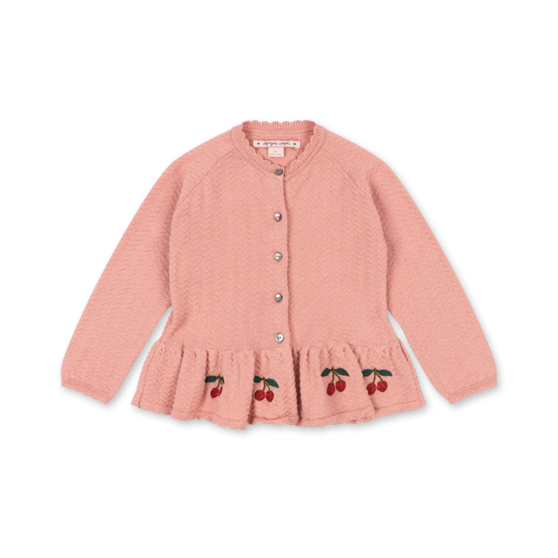 קרדיגן כותנה סרוג עם כפתורי אם־הפנינה בחזית. מעוצב בגזרת פפלום רחבה ובדוגמת סריגה גלית (סקאלופ).