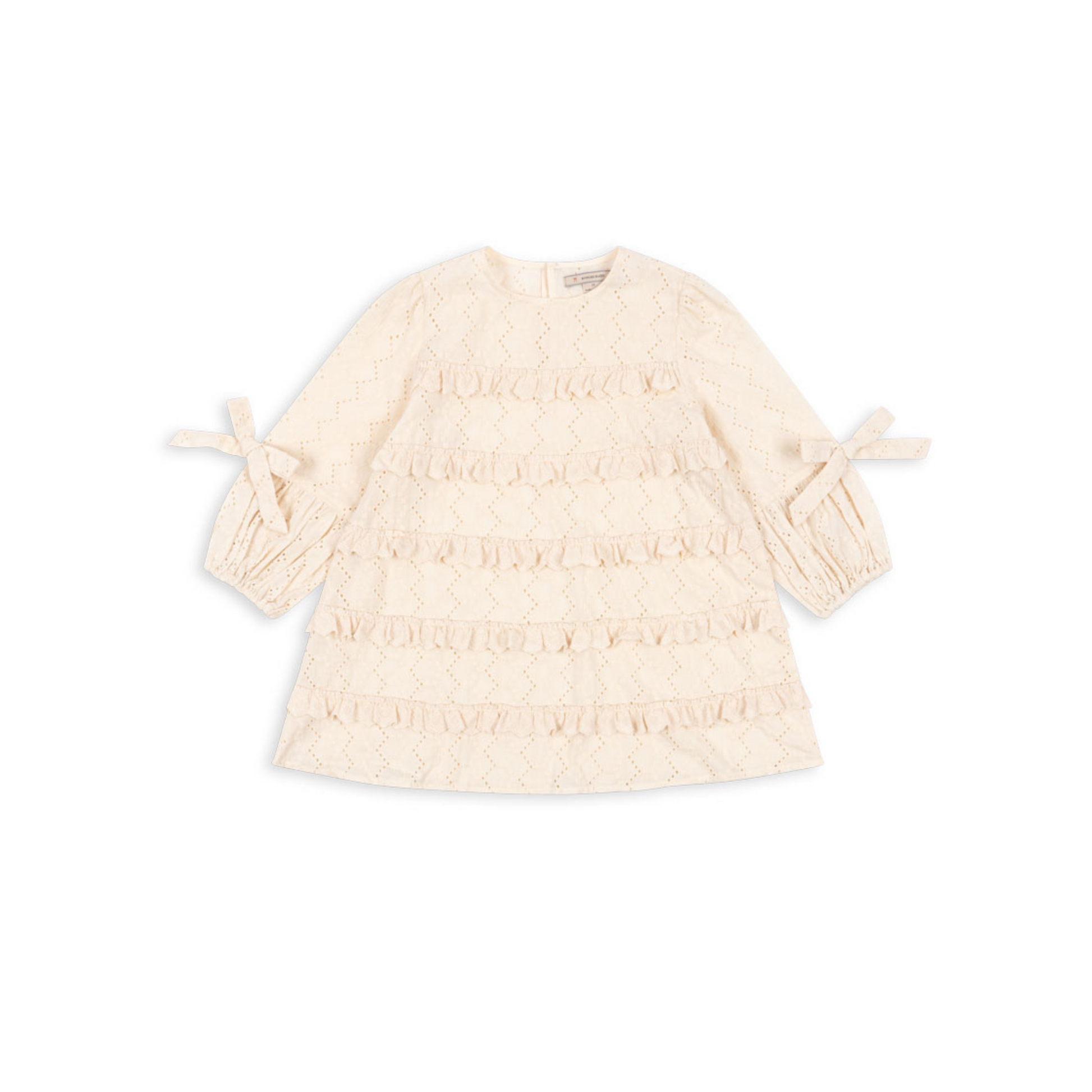 שמלת כותנה בעיצוב עדין מבדי רקמה בסגנון ברודרי אנגלז, עם פרטים של פריל לאורך כל הבגד. מעוצבת עם שרוולים בעלי גומי בקצה לנוחות מירבית. עשויה מ-100% כותנה.