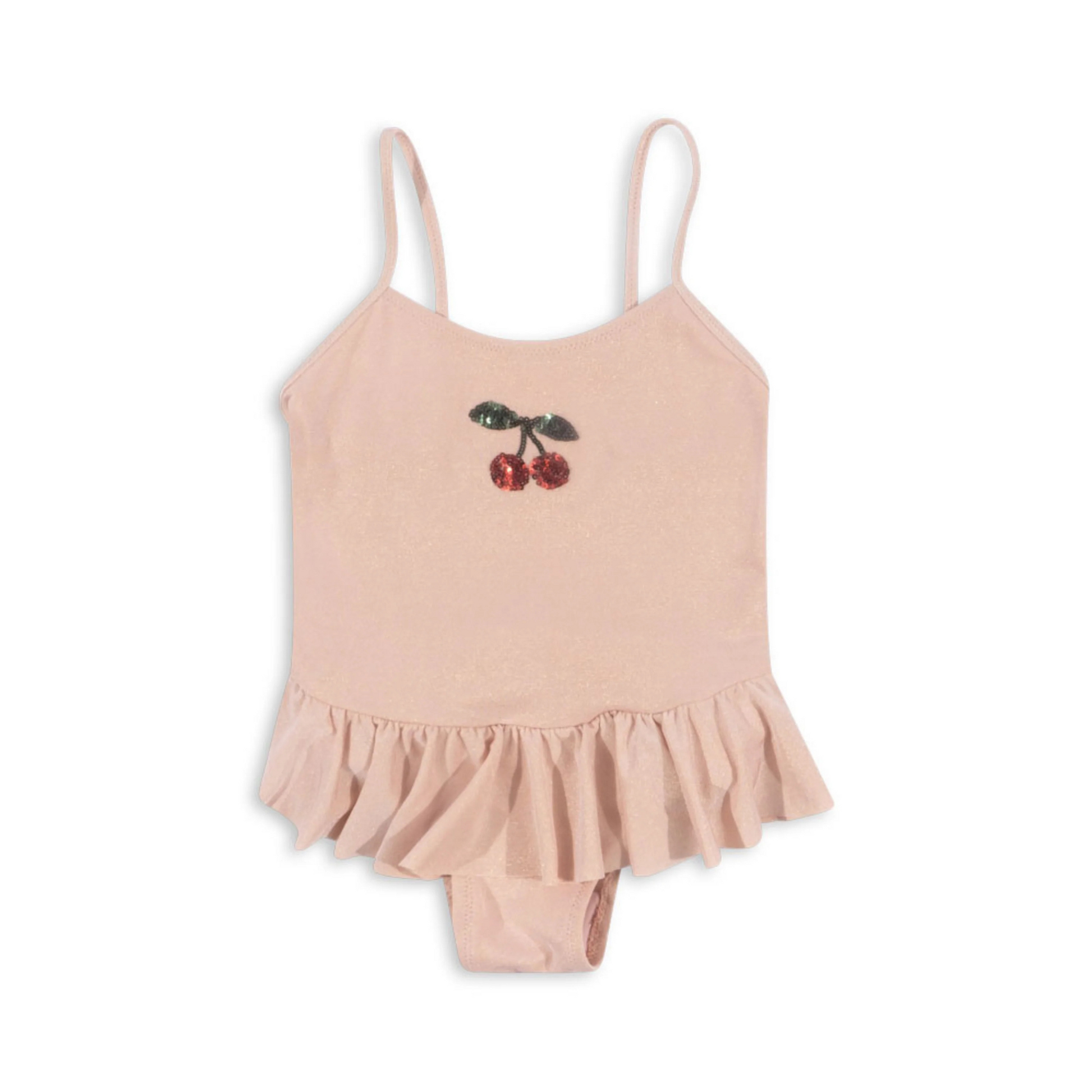 בגד ים בגימור מבריק עם קישוט פאייטים דקורטיבי בחזית.