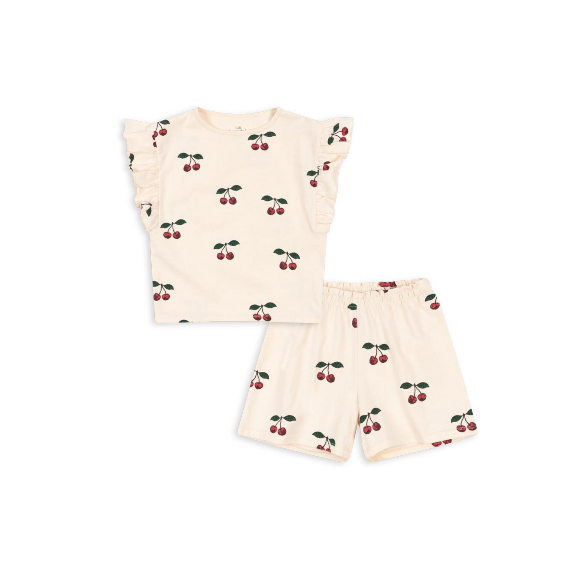 סט כותנה קלאסי הכולל טי-שירט ללא שרוולים עם פרנזים לאורך הכתפיים ושורטס רכים עם מותן אלסטית.