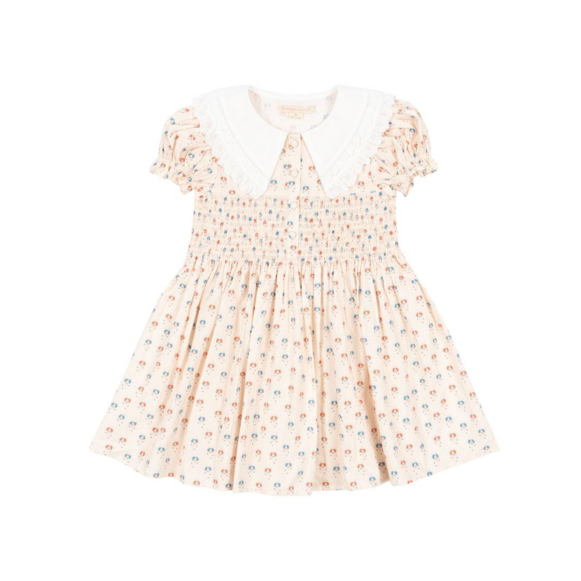 שמלת כותנה רכה עם שרוולים תפוחים, צווארון תחרה וחלק עליון במראה מעוינים (סמוקינג). עשויה מ-100% כותנה אורגנית, בעלת תו תקן GOTS אורגני, מוסמכת על ידי CU1094701.