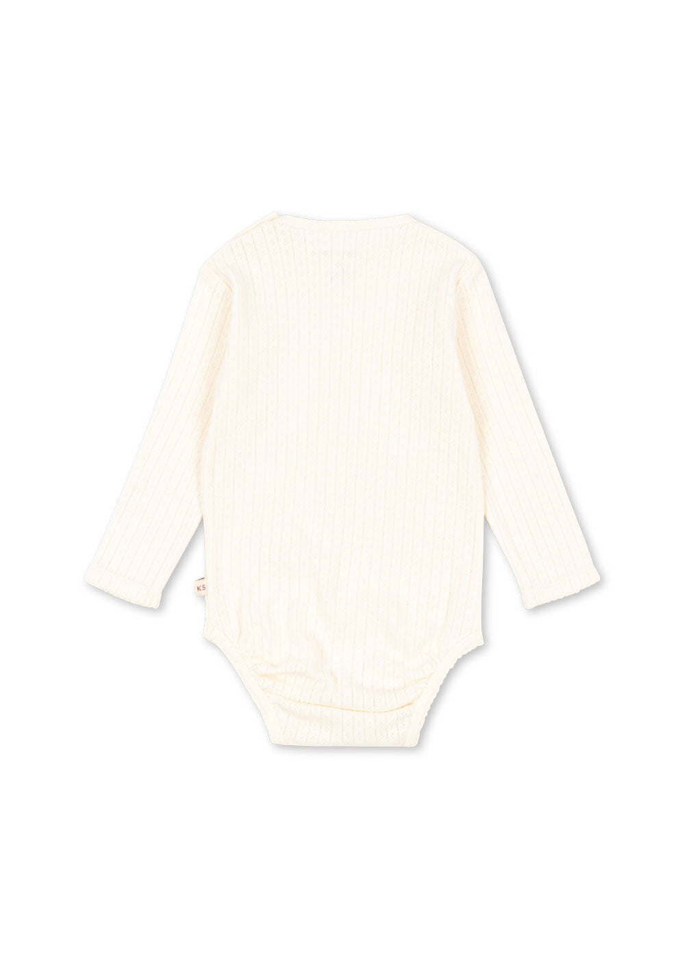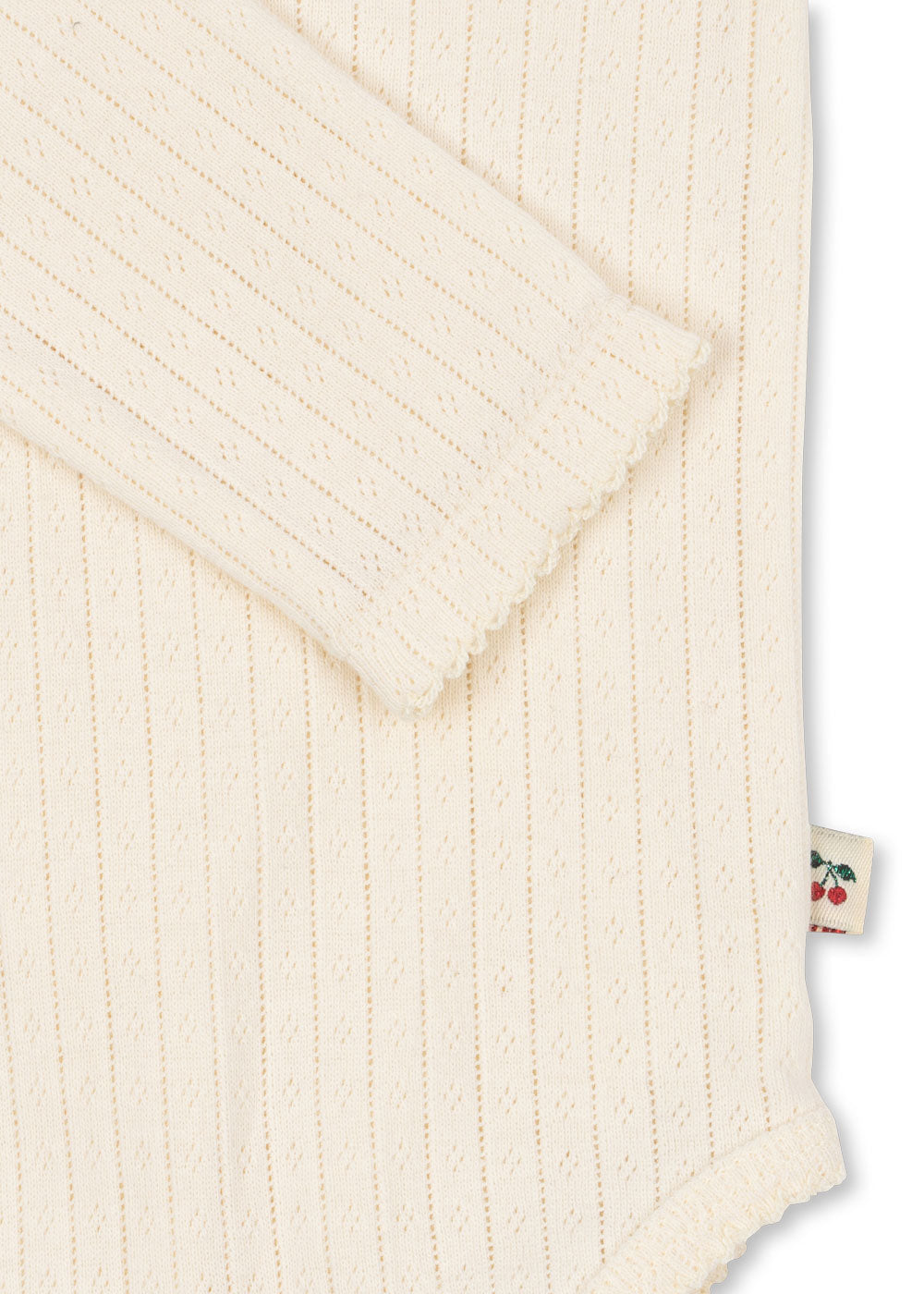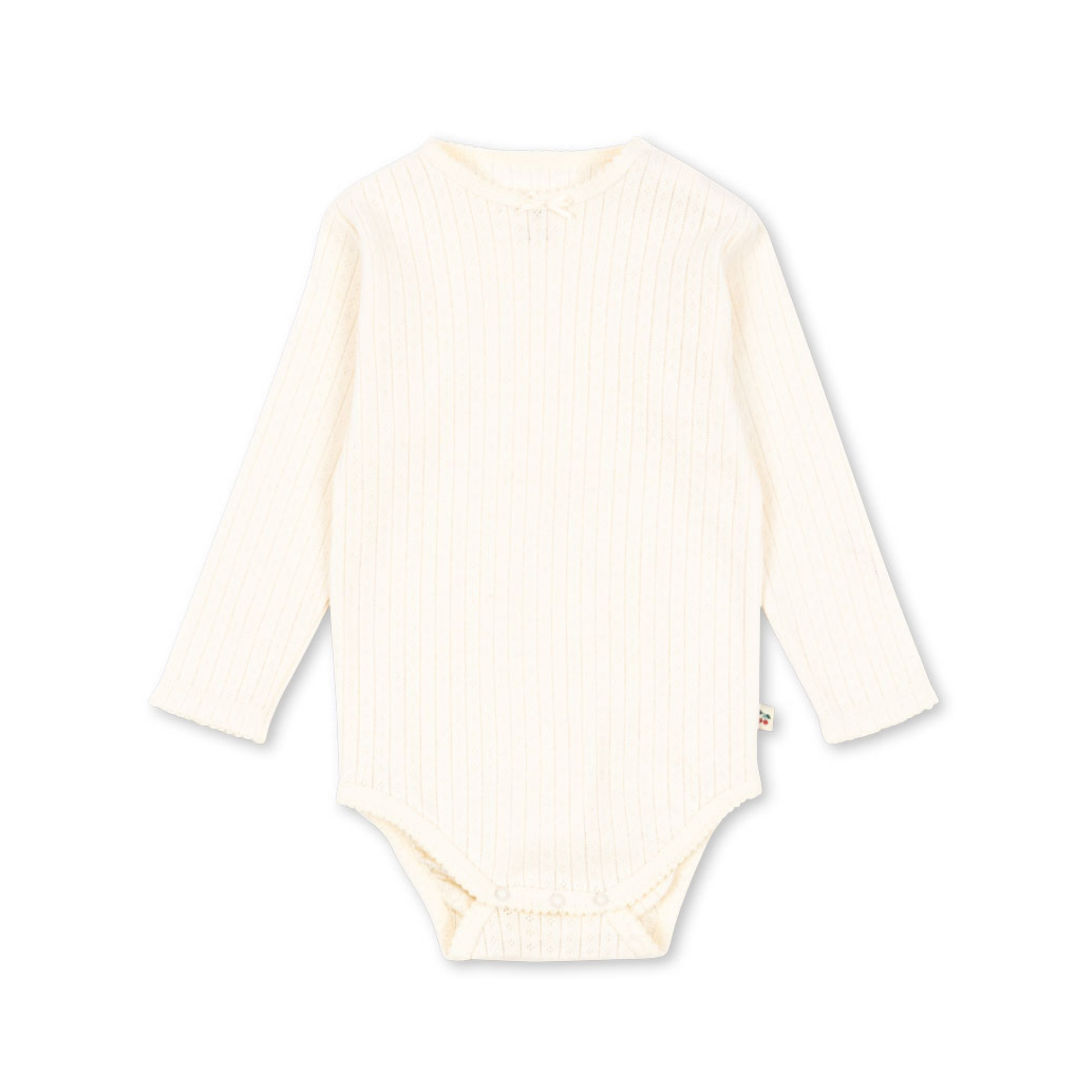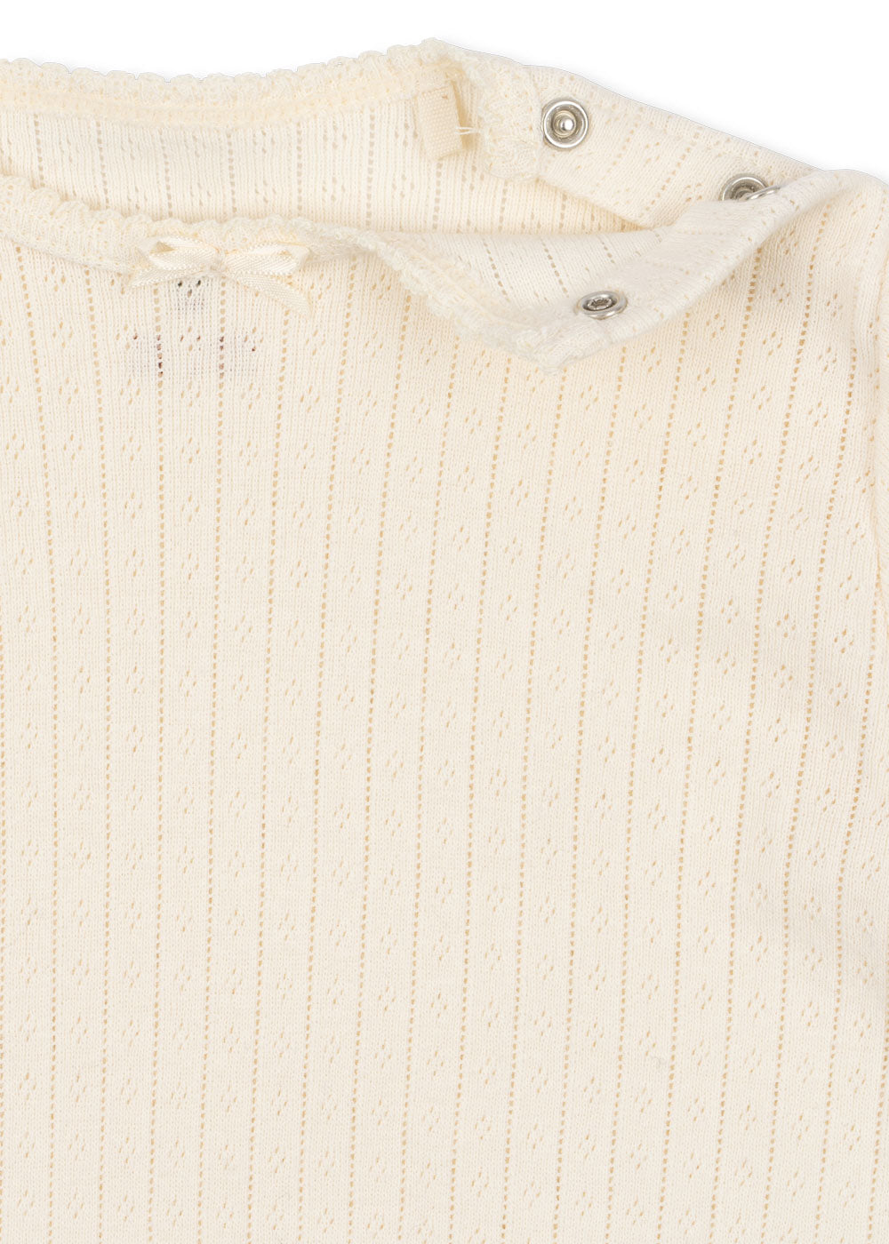בגד גוף רך מכותנה עם דוגמת פוינטל דקורטיבית. כולל כפתורי לחיצה במפשעה להלבשה קלה.