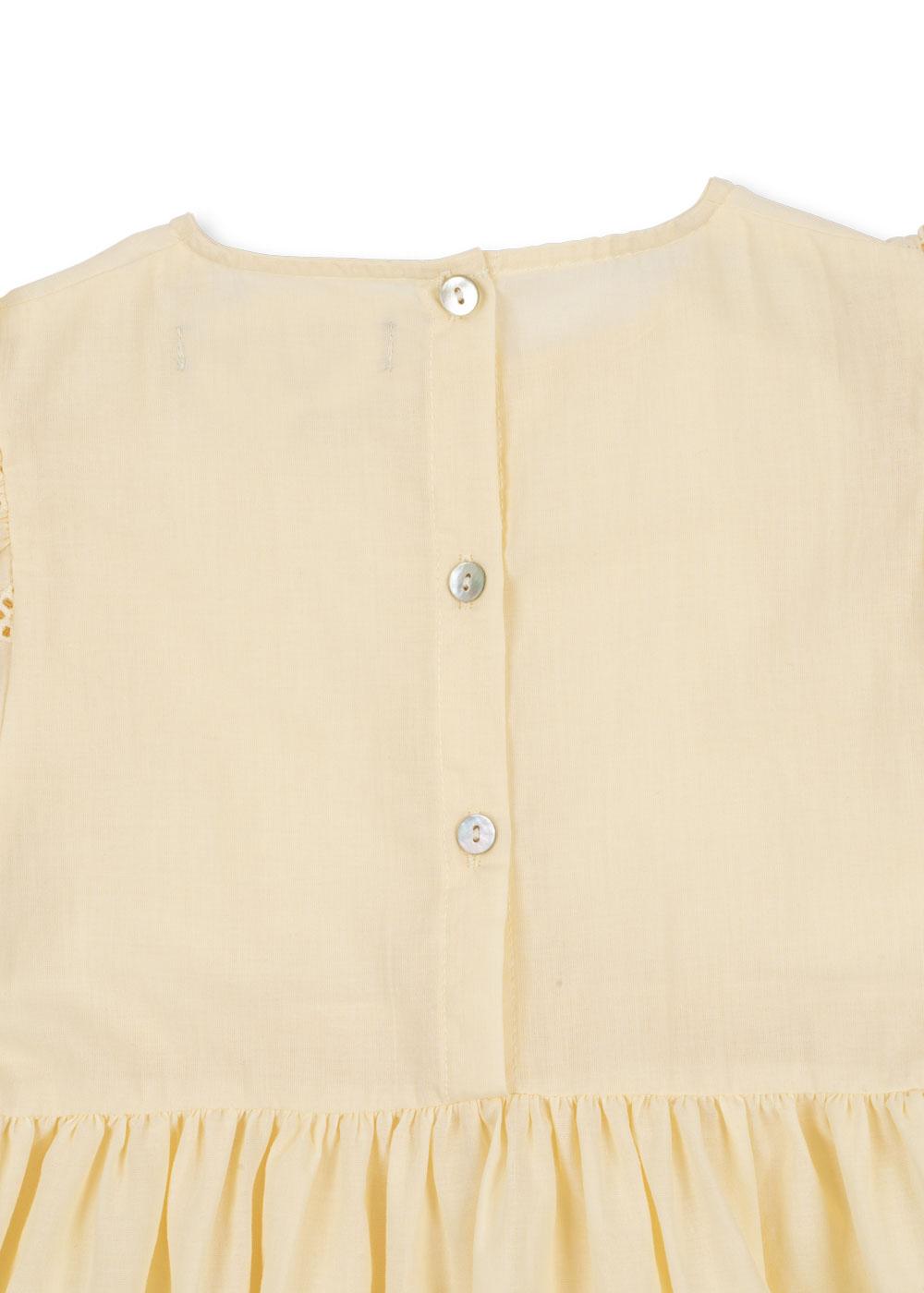 שמלה רכה וקלה מבד כותנה ווייל, עם פרטי רקמת ברודרי אנגלז דקורטיביים.