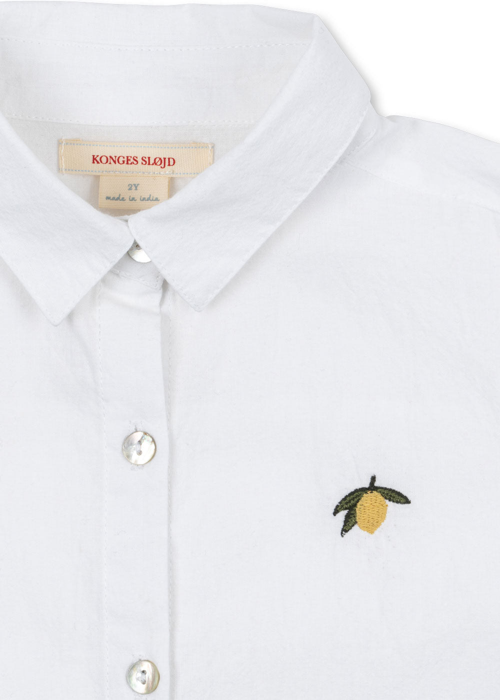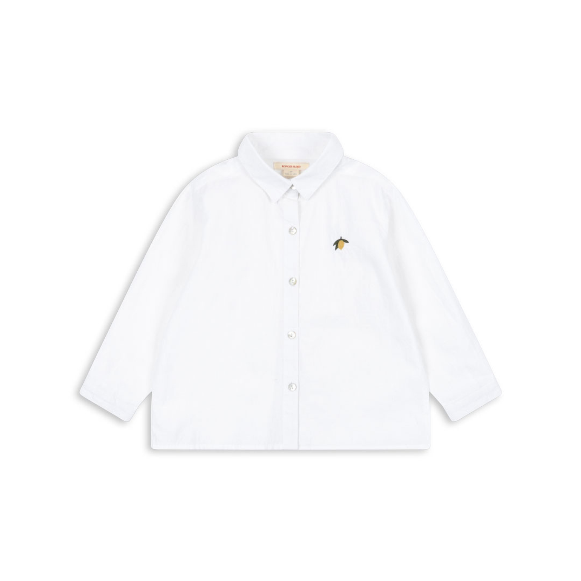 חולצה לבנה נקייה עם צווארון קלאסי, סיומות שרוולים עם כפתור צר והדפס לימון ייחודי על החזה. מעוצבת עם כפתורי אם הפנינה מלפנים. עשויה מ־100% כותנה אורגנית.