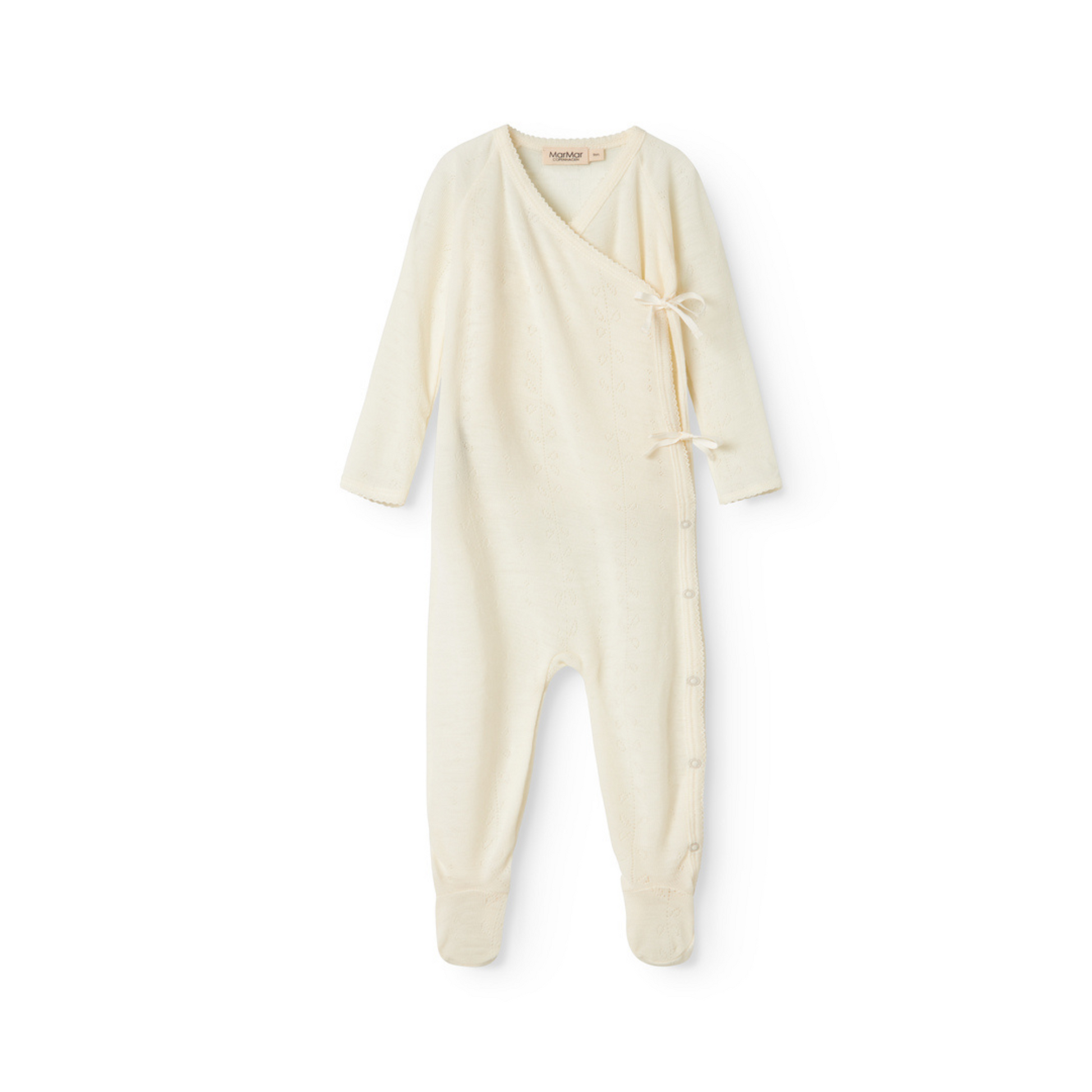 אוברול ארוך שרוול עם רגליים ליילודים. לאוברול סגירת מעטפת הנסגרת באמצעות תיקתקים וקשירה.